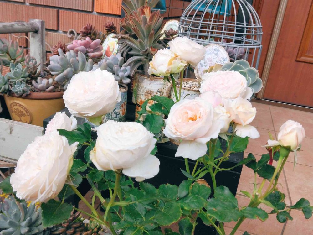 庭や家の中にDIYで作った物と一緒に多肉植物やバラ、寄せ植えをかざって、楽しんでます🌼