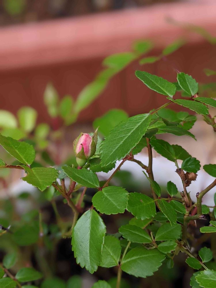 ミニバラのグリーンアイス。名前の通り最初は薄いピンクですが色が変化して薄い緑色に変わります。今はピンク色。