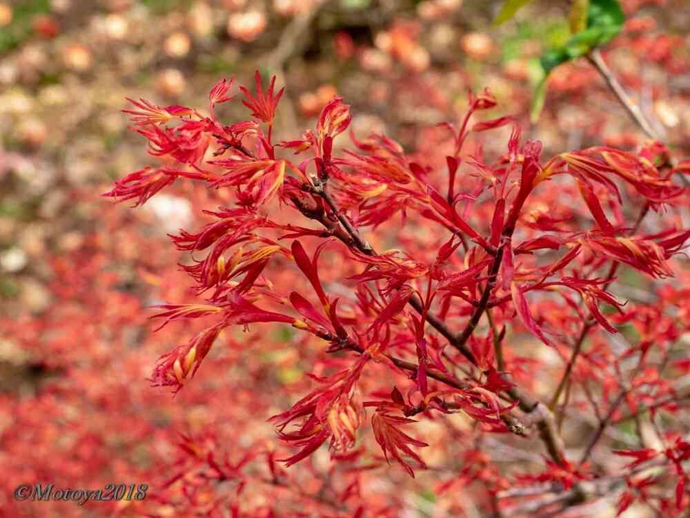 春の新芽は真っ赤です。だんだんと緑色になって秋には紅葉してまた赤くなるとか、でも春の新芽の方の綺麗と言われています。