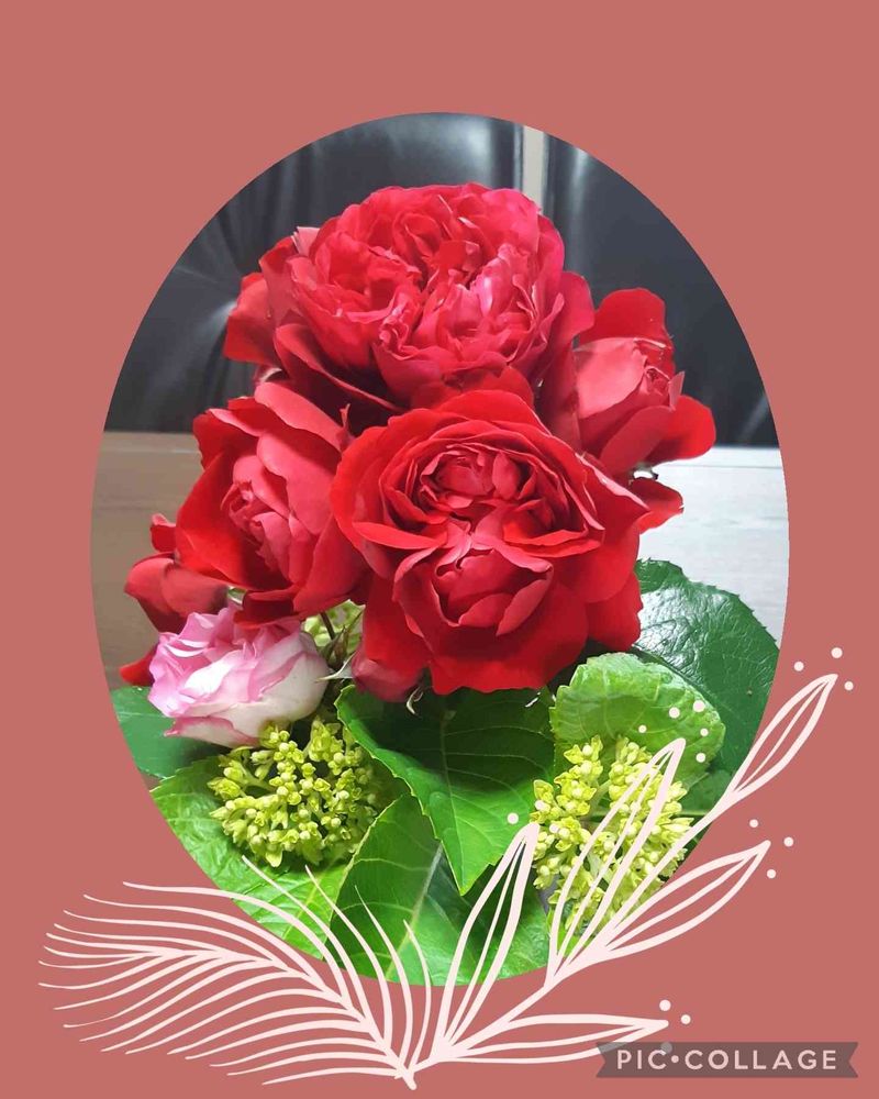 こんにちは👋😃午前中、お多福ガ-デンの薔薇フロレンティナ🌹の咲き終わりの花を、摘んでましたら、下向きに、一枝から、こんなに花束💐のように咲く薔薇🌹が、重たそうに咲いてたので、貰って来ました。庭のアジサイまだ咲いてませんが、お隣さんのじゃまに、なるので、一緒に、飾ってみました。