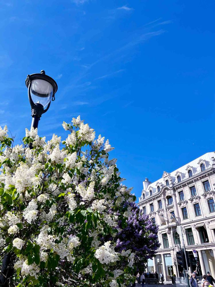 (写真はオスローの中心部で撮った、青空に映える白と紫のライラックです)