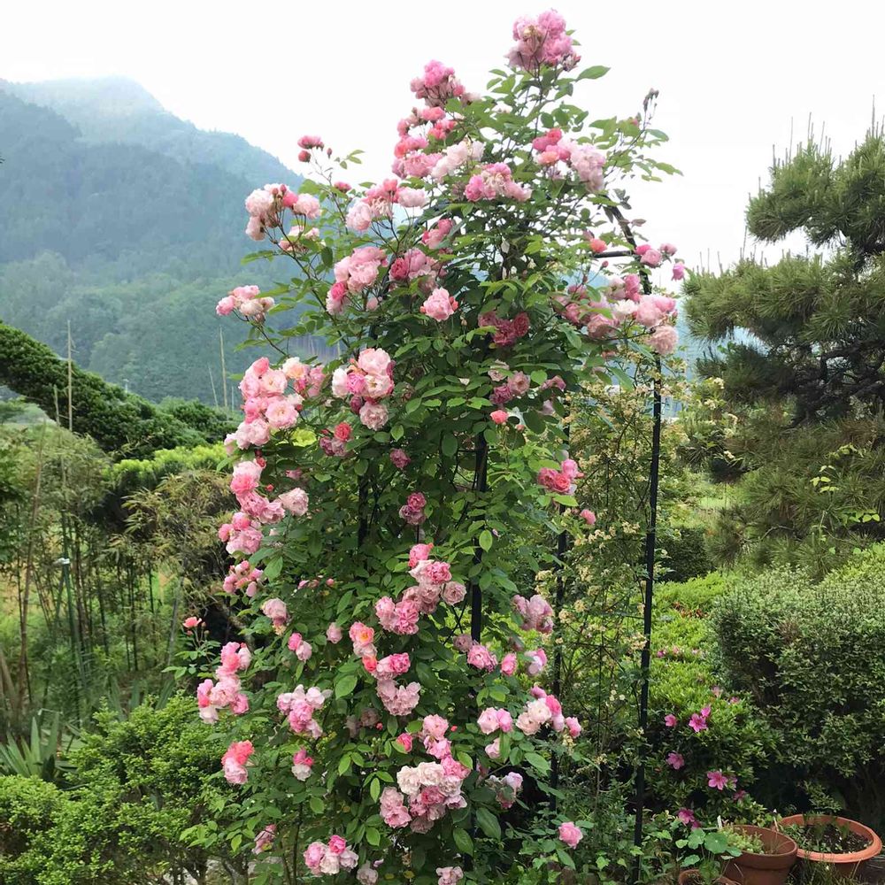 🧚♀️我が家のバラのアーチ、手前はコーネリア、向こう側は黄色いモッコウバラ、モッコウバラは先にさき終わってしまいました。