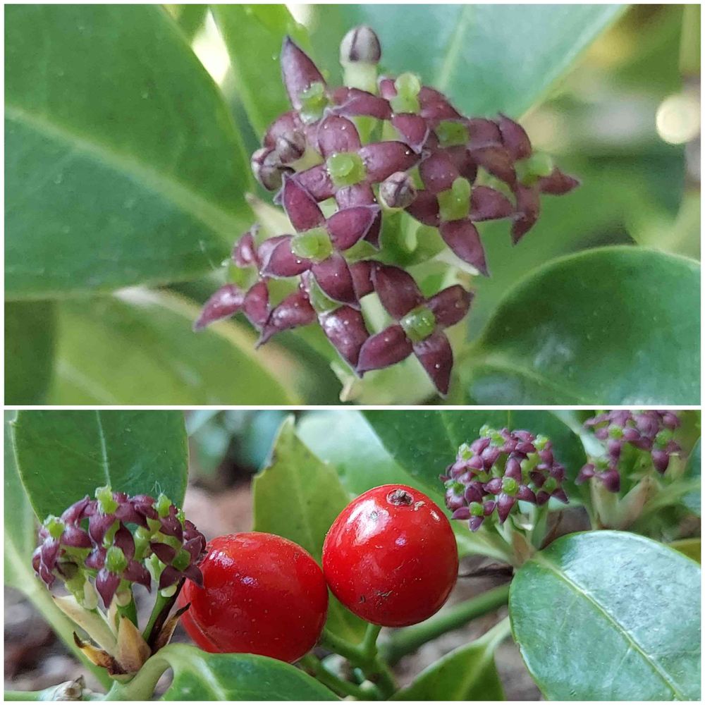 小さな庭,アオキの花,アオキの赤い実の投稿画像