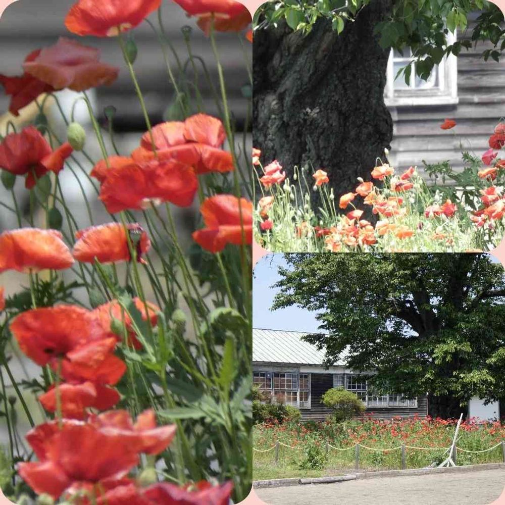 閉校になった校庭には、桜の木🌳を囲む様にポピーが植えられていました。昨年秋には、キバナコスモスでした。