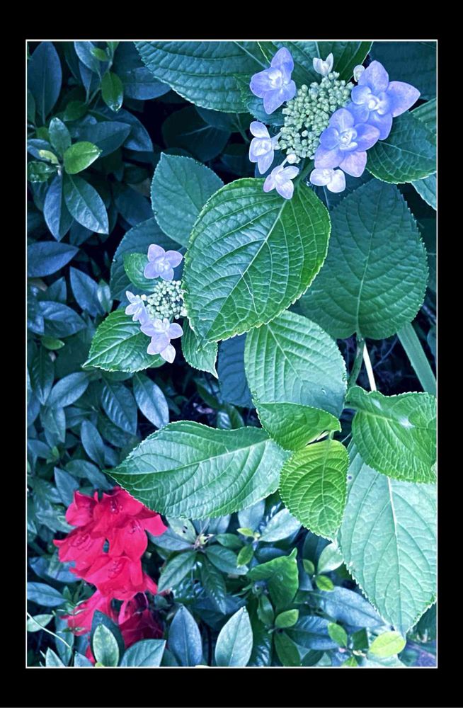 📝この写真画像は、小学校の泰山木を後にして、約5分、朝の散歩を終わって我が家に帰り着いて直ぐに、開花し始めた💠ブルー系のアジサイの花と最後になった真っ赤なツツジ:azalea:アザレアを撮影したものデス🐶