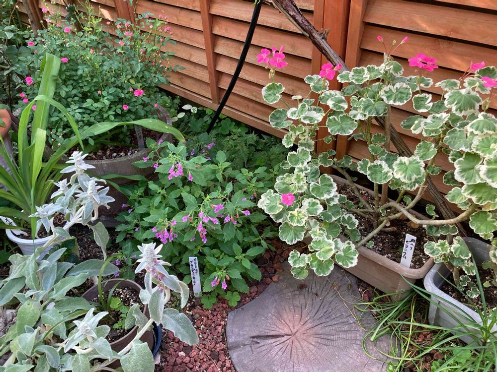 これも錦で良いですか❓ゼラニウムもお隣りのカラミンサも斑入りです💕お庭に斑入りの植物が増えて来て、ニンマリしています❣️❣️