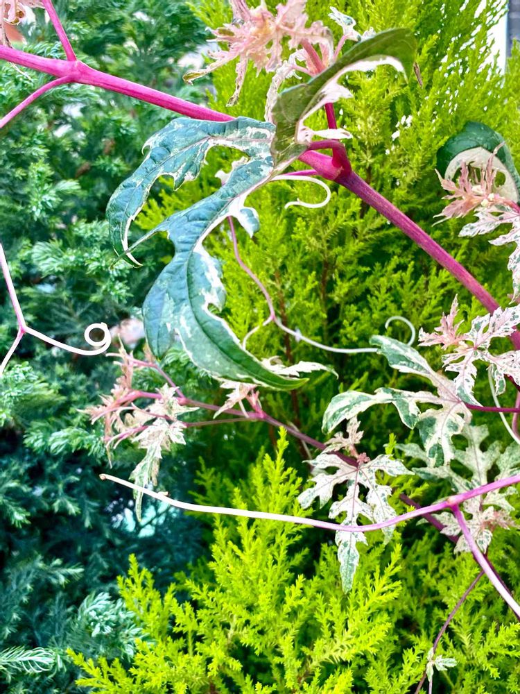 お店入り口左側のコニファーに絡む斑入りノブドウです🍇