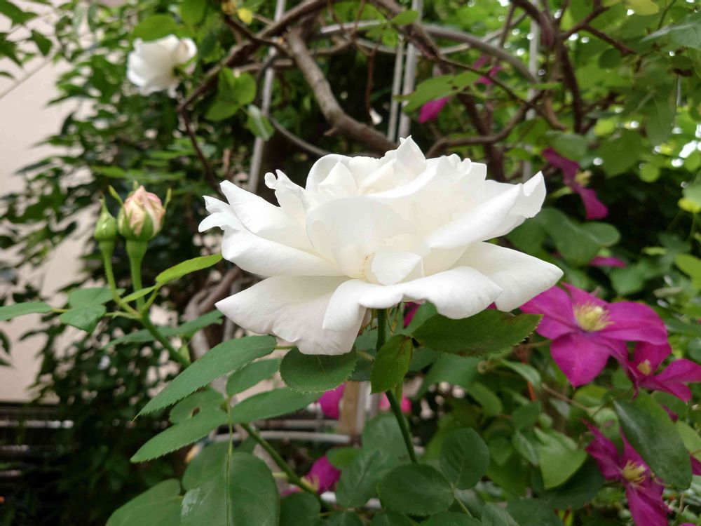真っ白な薔薇が無傷で咲きました。雨風の影響が少なく、とても綺麗です❣️。