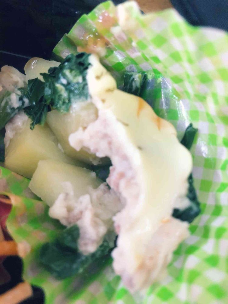 えっと、ほうれん草弁天丸。弁当に入れました!じゃがいもやチーズと一緒にいただきます