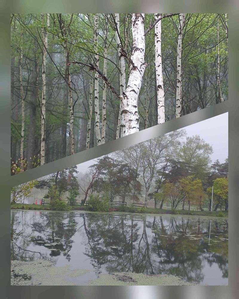 霧の白樺林と、朦朧とした白樺湖〜芽吹いたばかりの🌳🌲を写す、鏡池になってました