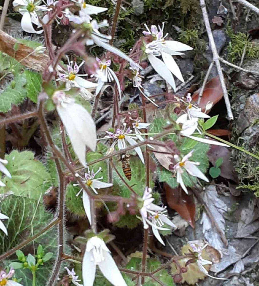 今日のお花。ユキノシタ。こんなに可愛いお花だったのかと再確認しました。小さな蜂さんがとまる瞬間が撮れました。
