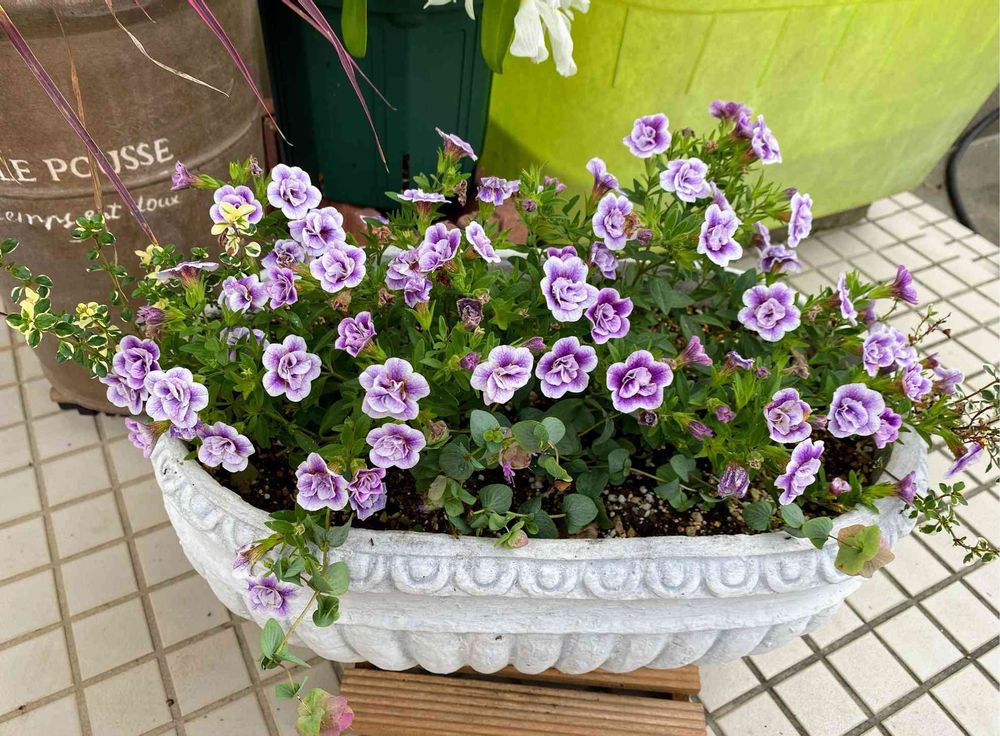 5月3日に作った寄せ植え。カリブラコア ウノダブル グレープフリル♡ 安定してきました♡こちらは5月20日の様子。後ろの緑は🐢亀吉の家。