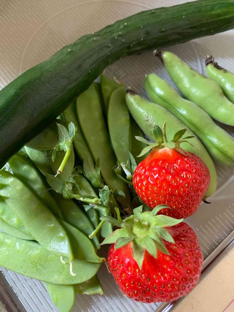 そら豆、スナップエンドウ、イチゴといろいろ収穫できました!