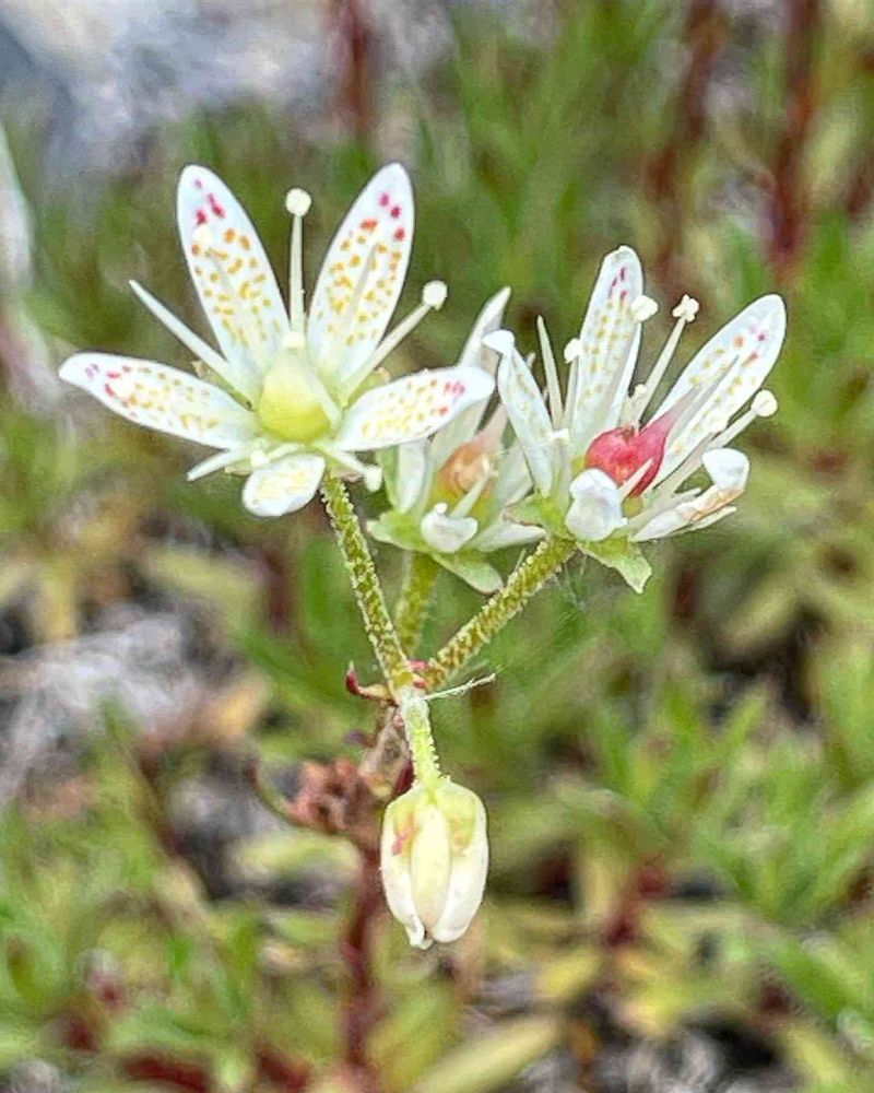 シコタンソウ(色丹草)は、高山に分布するユキノシタ科ユキノシタ属の小型の常緑多年草です。 細い根が地表で枝分かれしながら伸びて繁殖し、赤い花茎が立ち上がって小花を咲かせます。 白い五弁花の内側には黄と赤の斑点が多数見られます