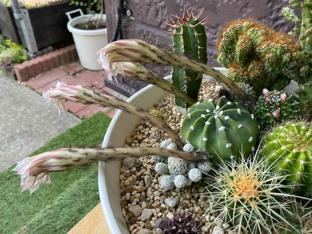 サボテンにもエケと同じように長く伸びる花芽の品種あるんですね〜知らないからびっくりでした🫢