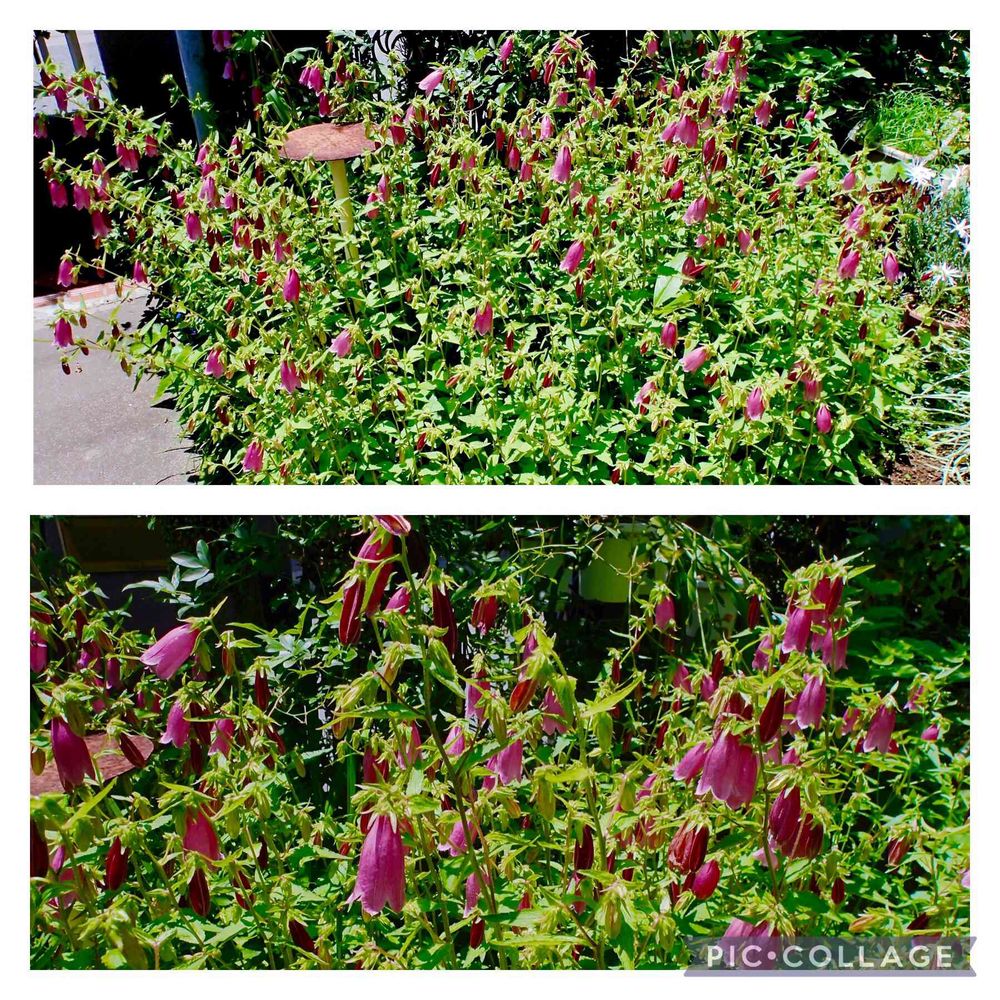 紫ホタルブクロ・山野草・多年草・草丈30〜80cm☘️上は、全景2m、小さな我が庭を、占拠中、下は、ちょつとアップで、