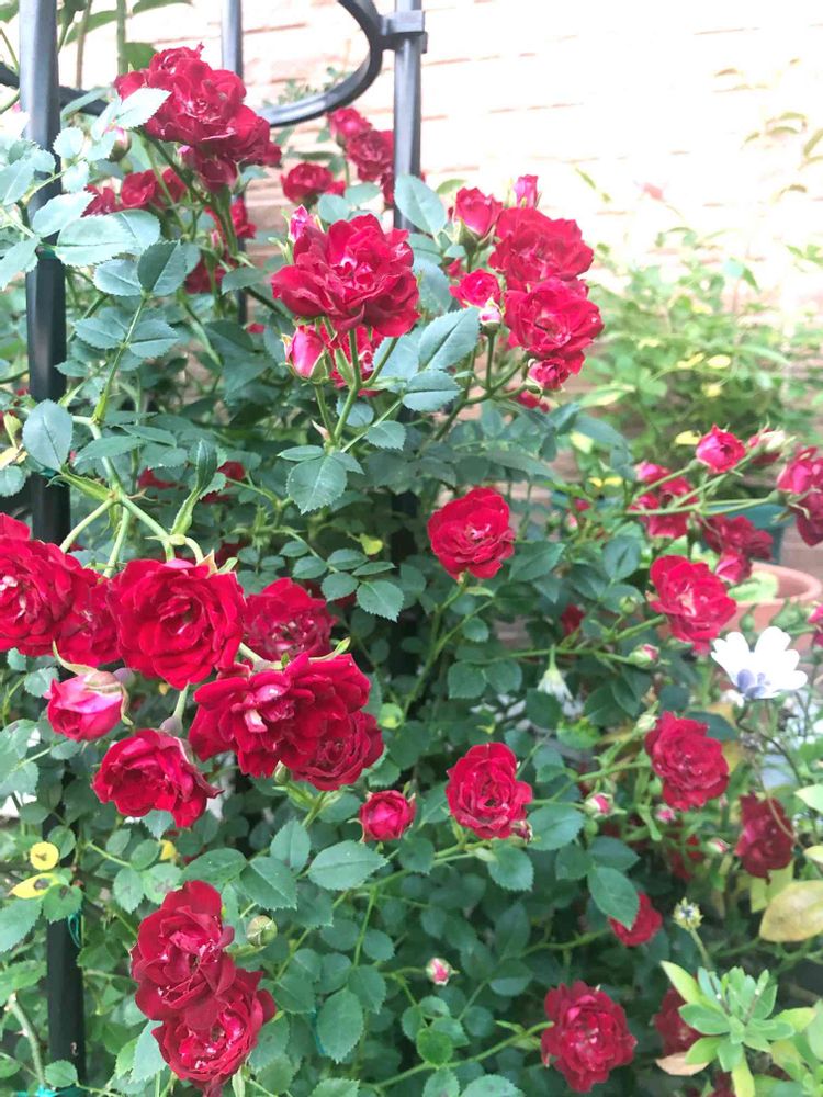 レッドキャスケードと言うんですね。オベリスクに這わせるぐらい樹勢ありますよね。私のもなんだか凄く蕾もあるし樹勢あるなあと思っていたのです。ちょっとした這わせられる薔薇なんですね。花後はひと回り大きな鉢に植え替えて私もオベリスク仕立てしてみようかなと思えました。