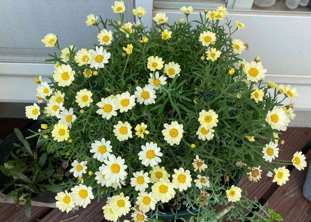 4月に一回り大きい鉢に植え替えて切り戻ししたイエローマーガレットとペーパーカスケードの鉢。マーガレットがまた咲いています♡