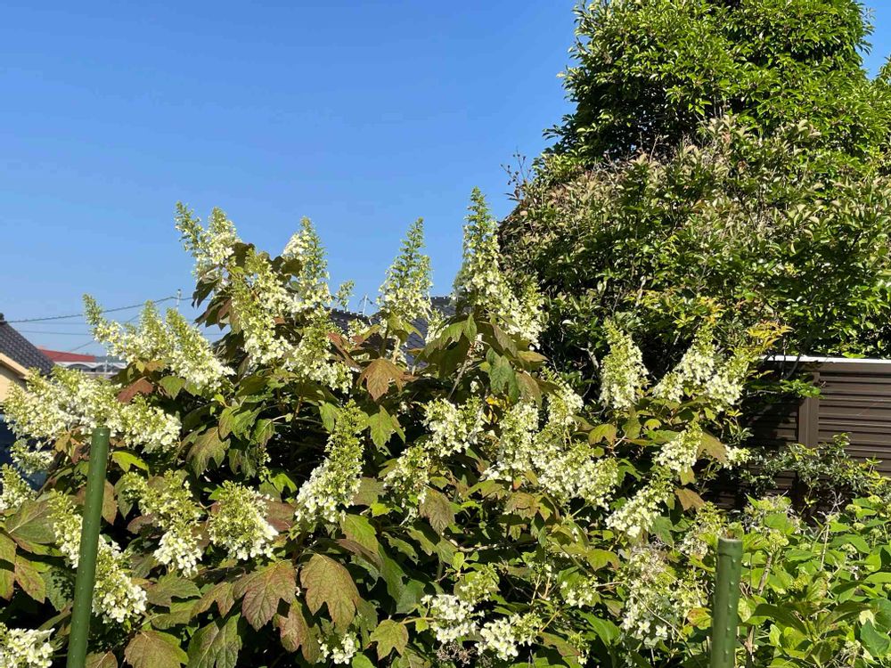 仕事帰りに、通り道のお宅の垣根越しに、カシワバアジサイが、沢山咲いていました。