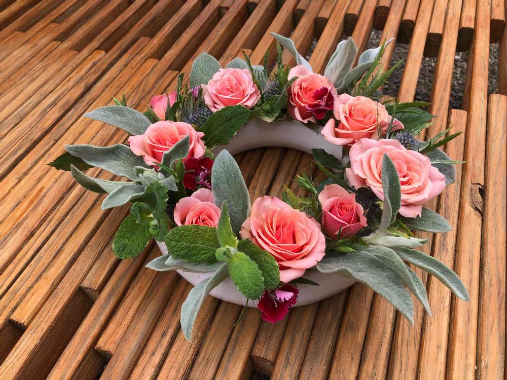 花材: スプレーローズ、ラムズイヤー、パイナップルミント、エリンジウム(エリンギウム)、ナデシコ
