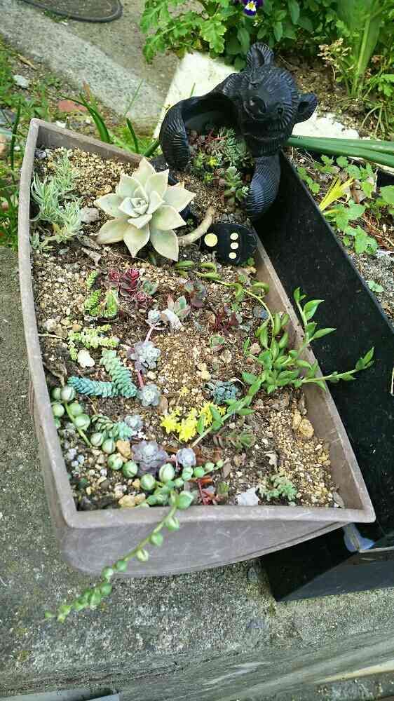 父さんが1本だけ暴れ多肉ちゃん植えてたので家に居るセダムなんかを持ってきて挿し込み😁