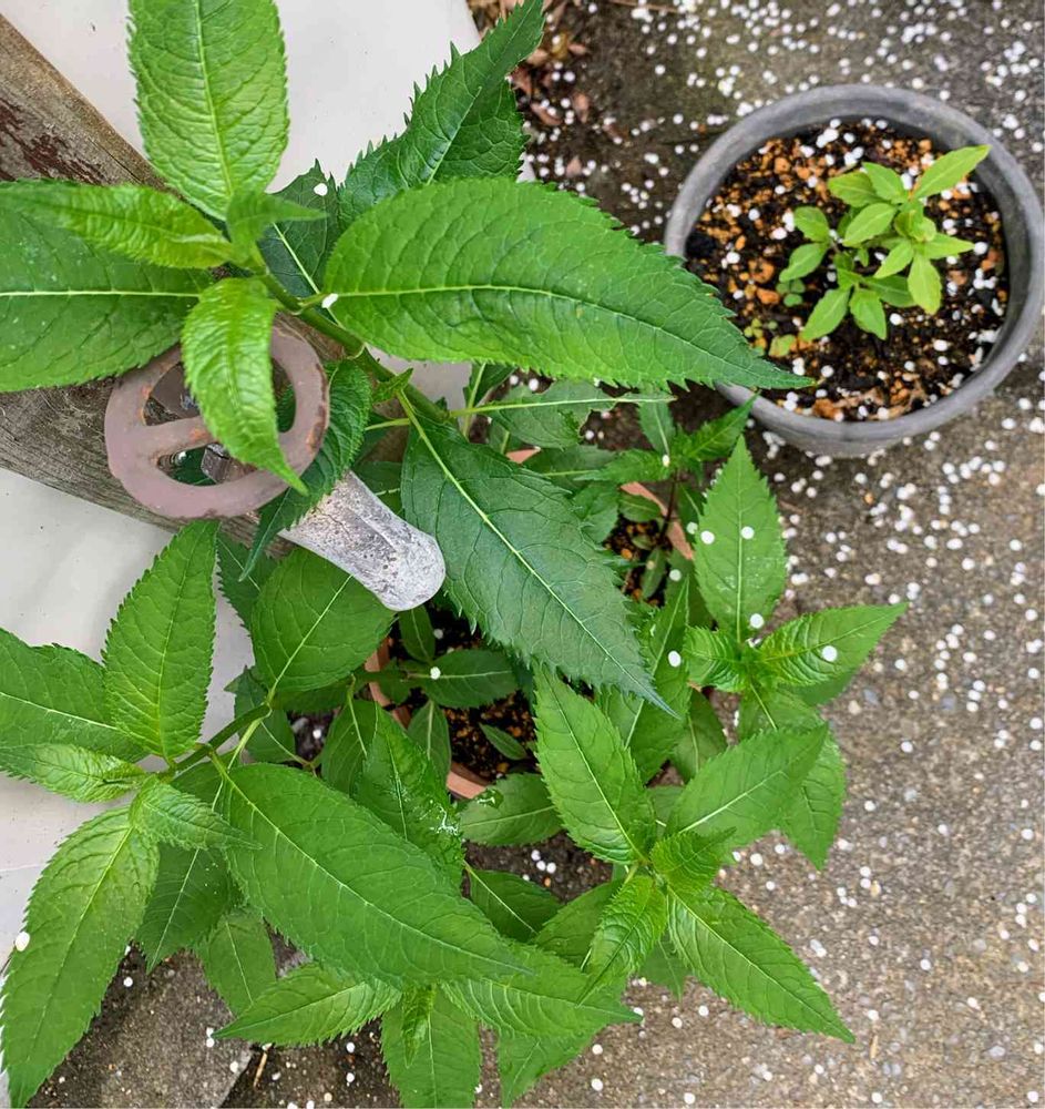 我が家の水さしは鉢に移して、蕾が付いてますが、葉っぱはワサワサではないね。