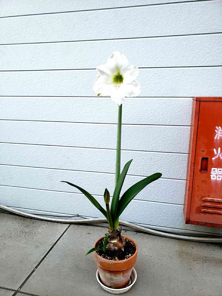 花茎が立派すぎて玄関前ではカメラから見切れてしまうので、わざわざ廊下の消火器前まで担いできて引き目に写真を撮った。