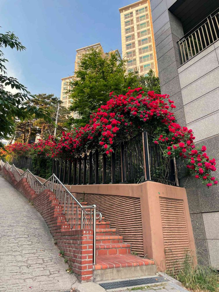 去年の5/27には上から撮ったpicを投稿しましたが、今年は下から😅韓国のマンションフェンスはたいていこの赤い蔦バラ🌹が植えられてて、五月には国中真っ赤になる(ちょっとやりすぎ😅) 泥棒避けらしいですが、21世紀にフェンス乗り越えて侵入するドロちゃんがいるとは思えない…🤣