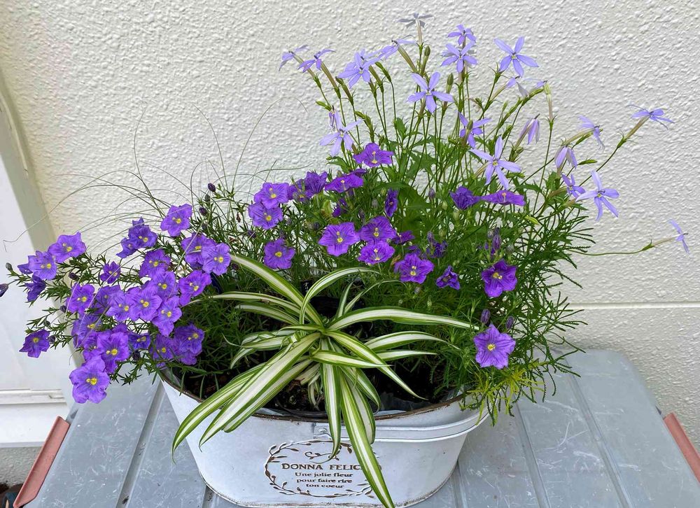 ニーレンベルギアとイソトマの寄せ植えニーレンベルギアが1部倒れてきちゃったので支えるために、株分けしたオリズルランをポットごと置いちゃいました!(๑>ᴗ<๑)