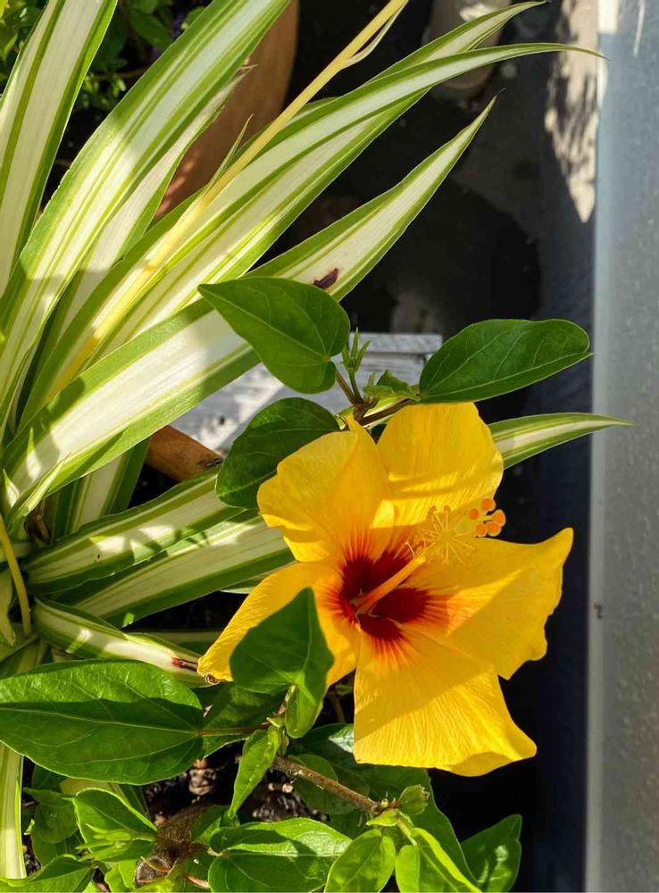 壁の方を向いて ハイビスカスがこっそり1番花をつけていました♡