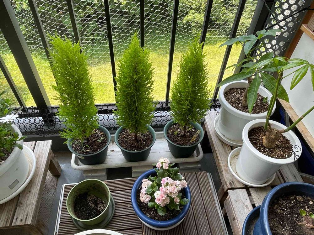 冬の花と寄せ植えしてたゴールドクレスト、花が終わったから小さな鉢に植え替えしたら、もうこんなに大きくなってしまった。