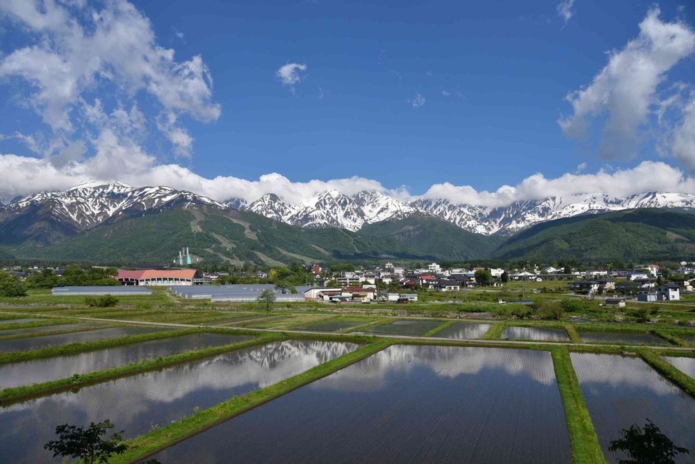 田んぼに水が張られ、白馬山系の映り込みが確認できます。