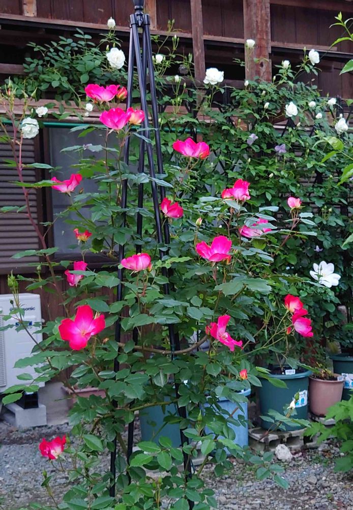 手前のつるバラと奥のつるバラが何かいいコンビ🥰