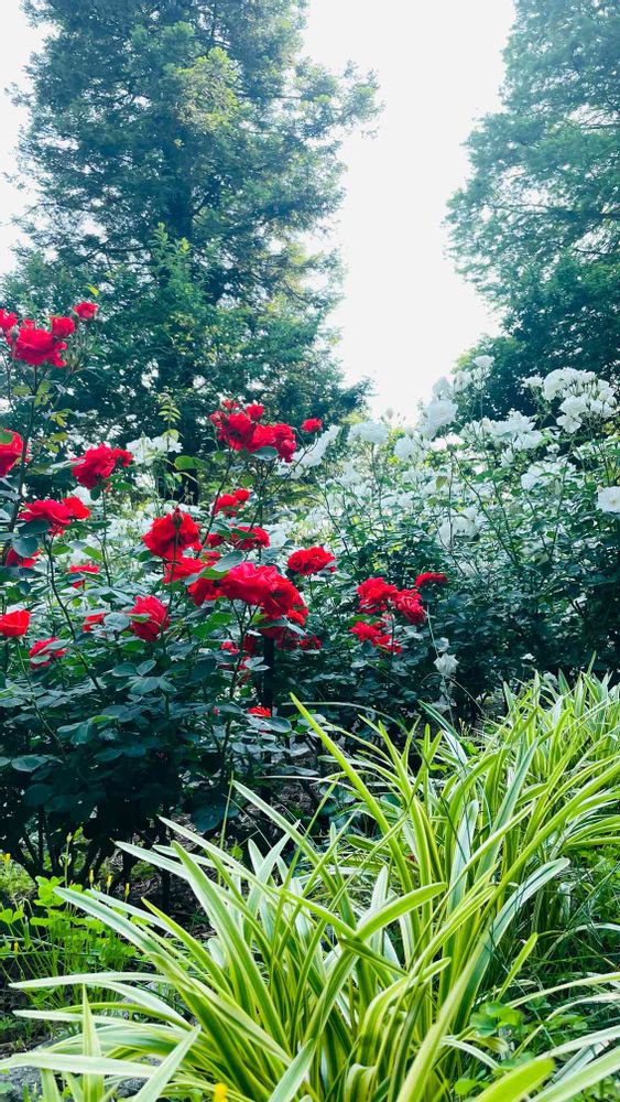 木と紅白の薔薇、そして一番手前の植物全てが美しくパーフェクトな風景でした☺️🌹🌿🌿