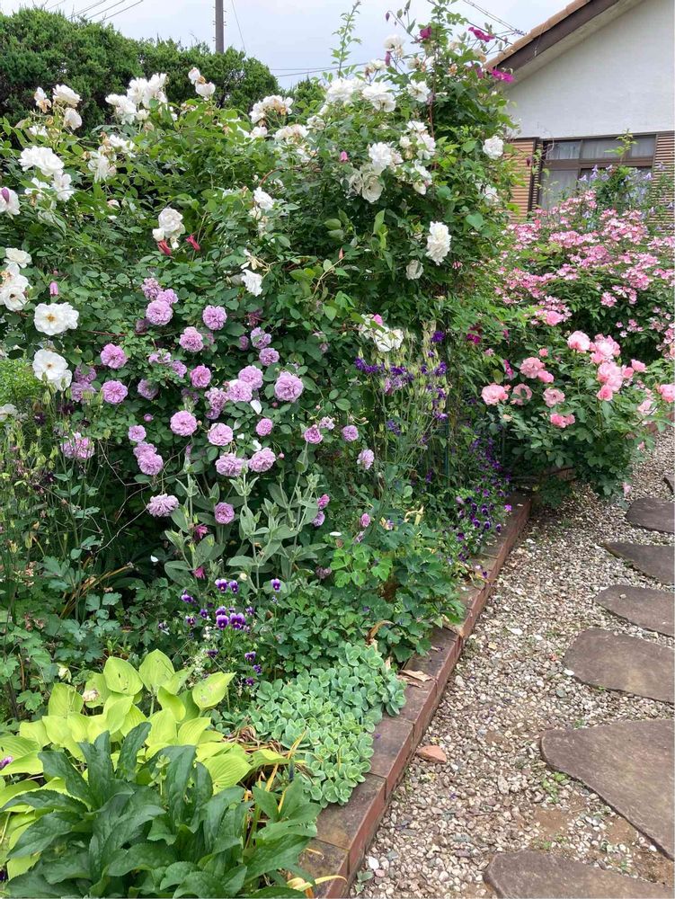 アプローチ右側も左側も素敵~✧︎*。バラ園のようです~🌹🌿 美しいバラさんたちと足元のお花さんやリーフがキレイに植栽されていて素晴らしいです(*Ü*)ノ"♡