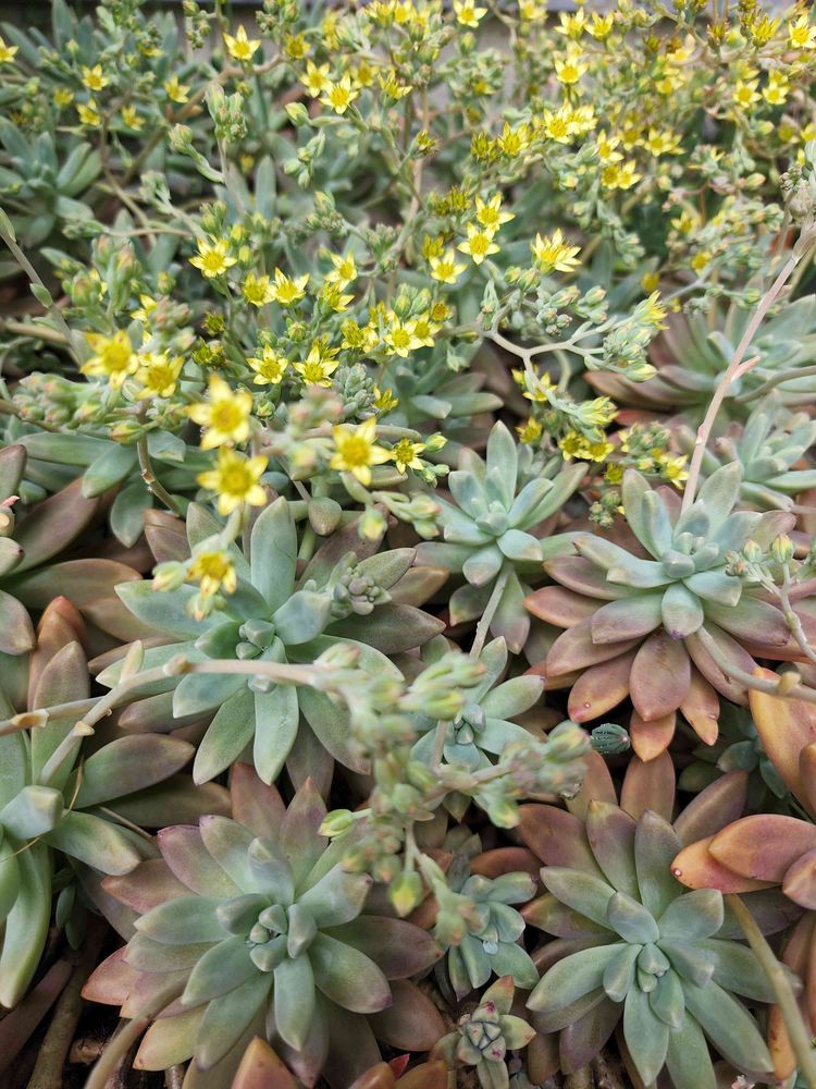 畳1畳強の花壇(?)に地が見えないほどの多肉にこれでもかと星型の黄色の可愛い花がニョロンニョロンしてます