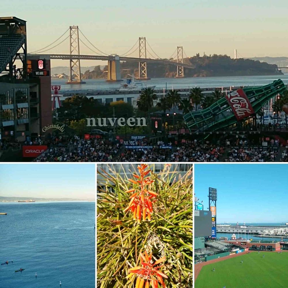 ベイブリッジの眺めと、球場前に咲いていた、ジャイアンツカラーのお花です😙