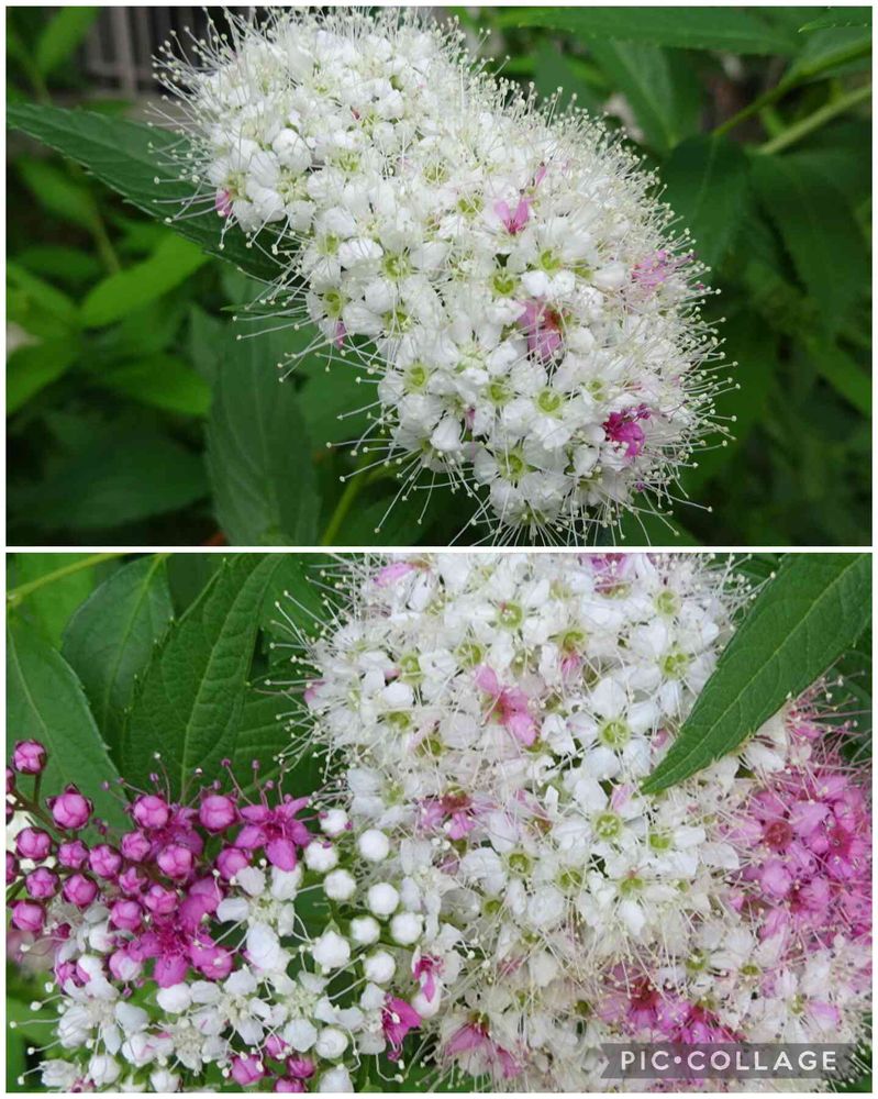 ゲンペイシモツケは、一株から白とピンク色の花を咲き分ける品種で、「源平咲きシモツケ」とも呼ばれています。