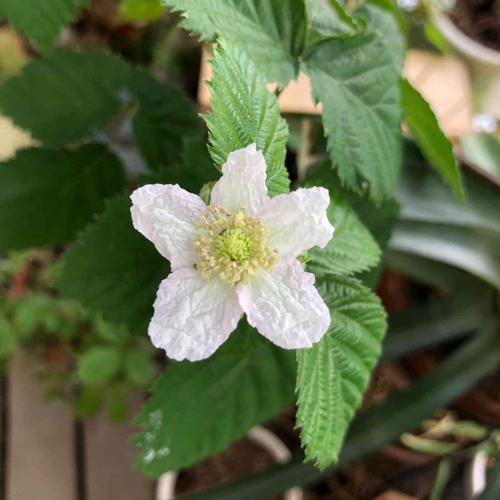 ブラックベリーの花。思ってたよりも花びらが薄くて、瑞々しく張ってない。水が足りないからか?