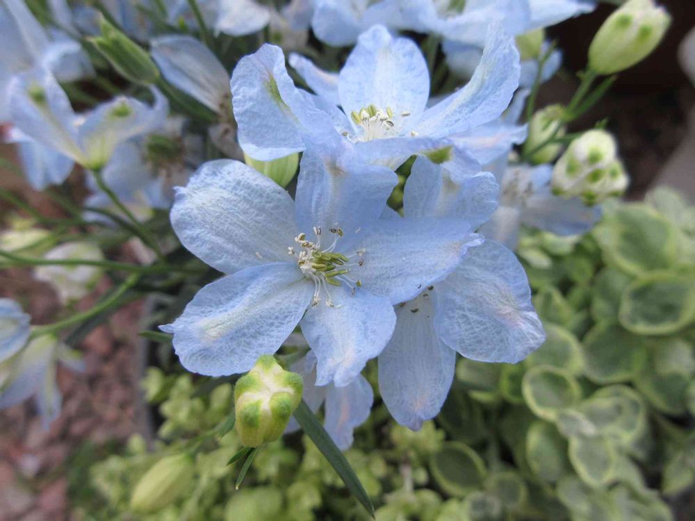 さん、そうそう写真右上のグリーンが入ってるのが蕾なの。水色の、お店では寄せ植えになってるのしかなくて、たまたまネットにあって、他のもの買うついでに買いました(*^▽^*)