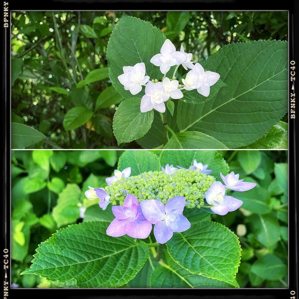 📝この写真画像は、万葉の中庭で、今朝の6時過ぎに開花していた白色系とピンク色系のアジサイの花を撮影したものデス🐶