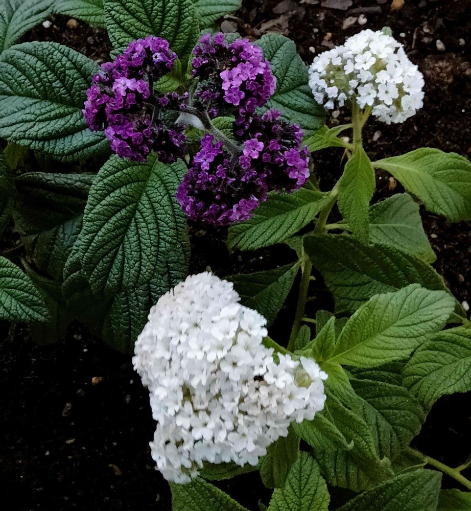 ヘリオトロープの白は珍しいのですね🌼普通にお手頃価格でスーパーの花苗売場に売っていましたが•••しかも、白3紫1ポットと白の方が多く残ってました😳。