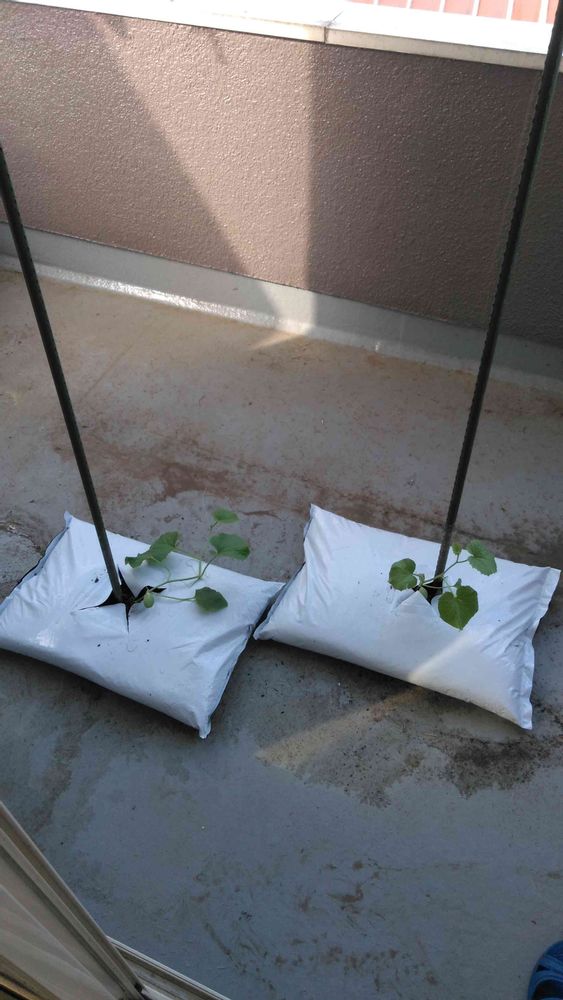 去年まではトマト同様に袋の上をカットして深い鉢の様な形にしていましたが、ウリ科は根が横に浅く広がるので、今年は袋の真ん中に穴を開けて定植して見ました♪😆