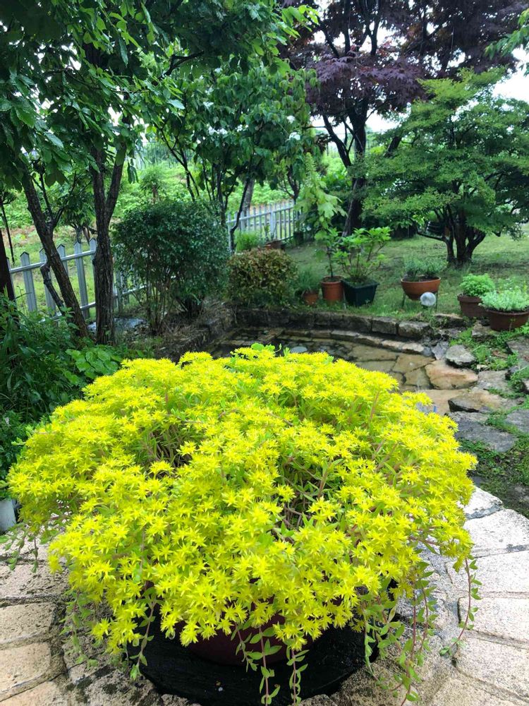お庭の木の緑がとっても美しいね。ツルマンネングサ(鶴万年草?)縁起がいい名前。