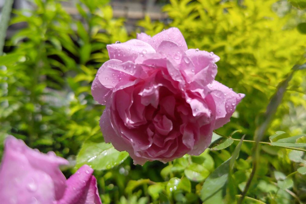 雨にやられましたが、シャローカップ咲きのコテージ・ローズ愛らしいウォームピンク色に咲きました。