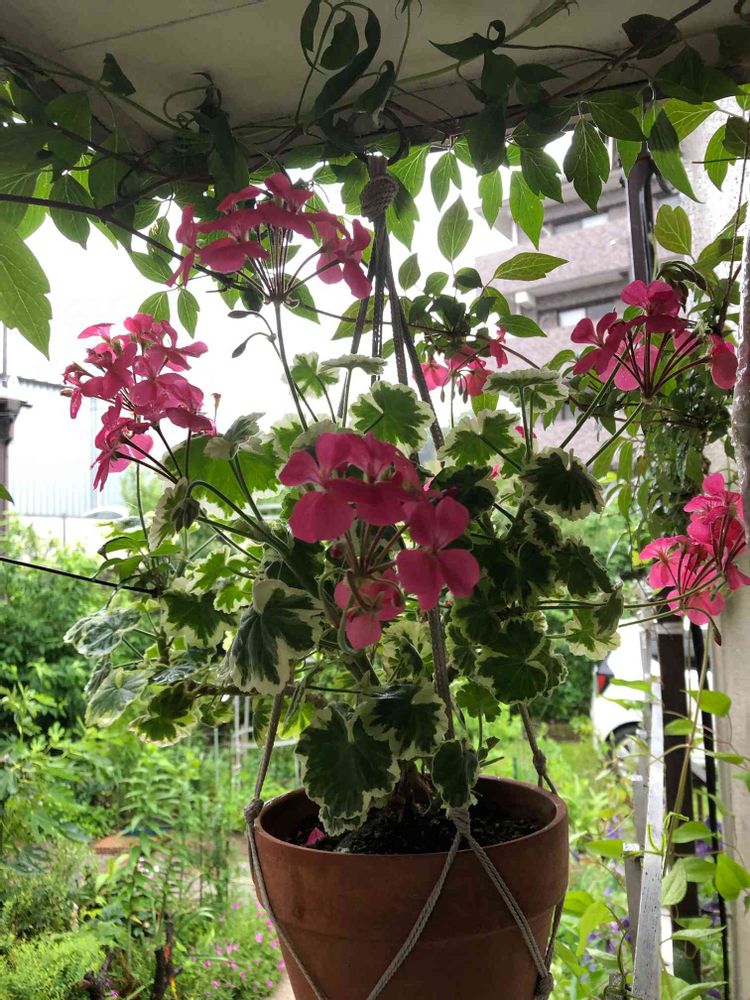 軒下に吊るしている斑入りゼラニウム💕