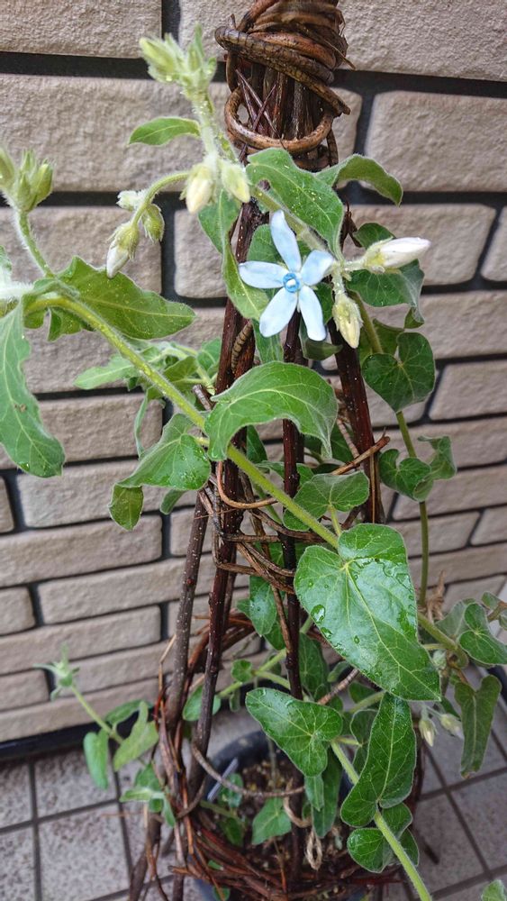 なんとか雨もあがりましたが、昨夜から雨と風がひどくて、咲き出したブルースターも倒れてしまい、去年庭の枝で作ったツリーを支えにしてなんとか保ってます😅