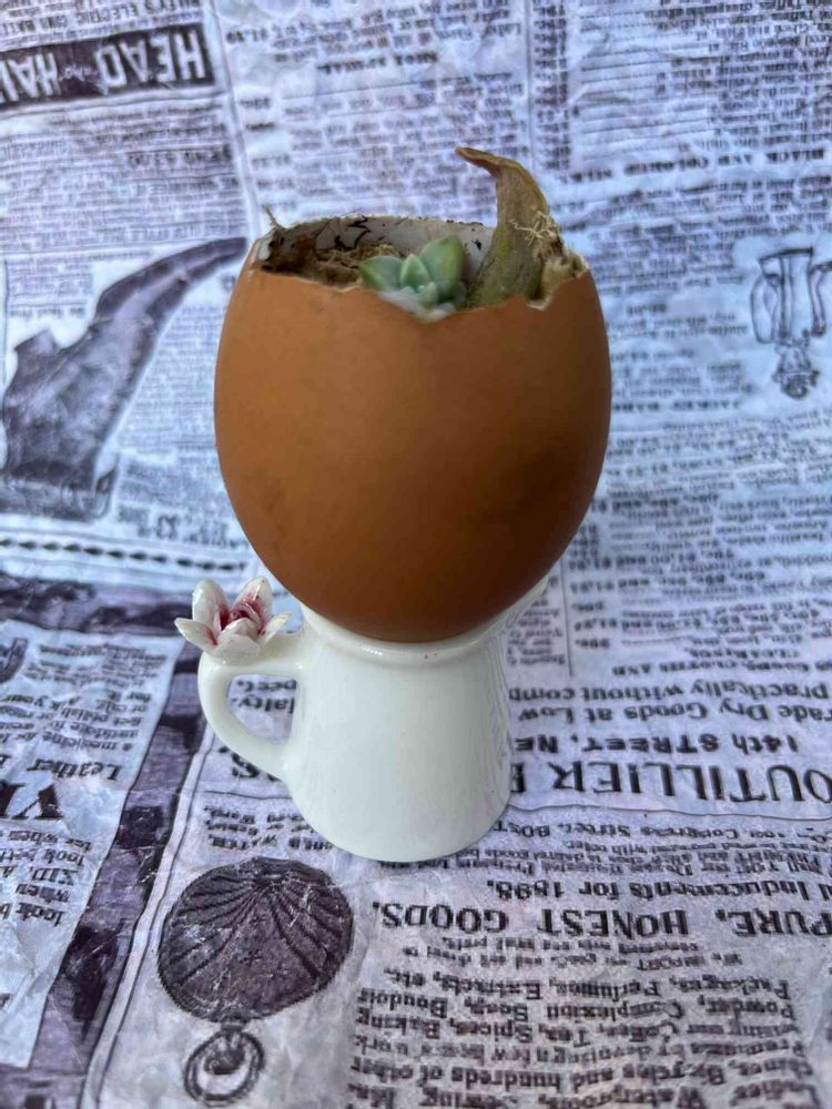 モロゾフのプリンカップに続き、今度は卵の殻をコツコツ叩いたよ。ギザギザに割れたけど、卵は割れるものだから仕方ないよね。ギザギザ卵に葉挿しを置いてみたけど、うまく育つかな〜。