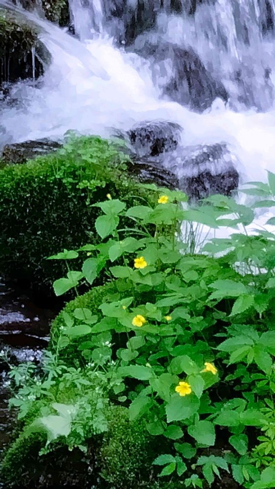 滝の飛沫と風圧に負けずに咲いてる黄色い花、山吹草かと思ってたんですが、遠くて😂なんか違うかも?