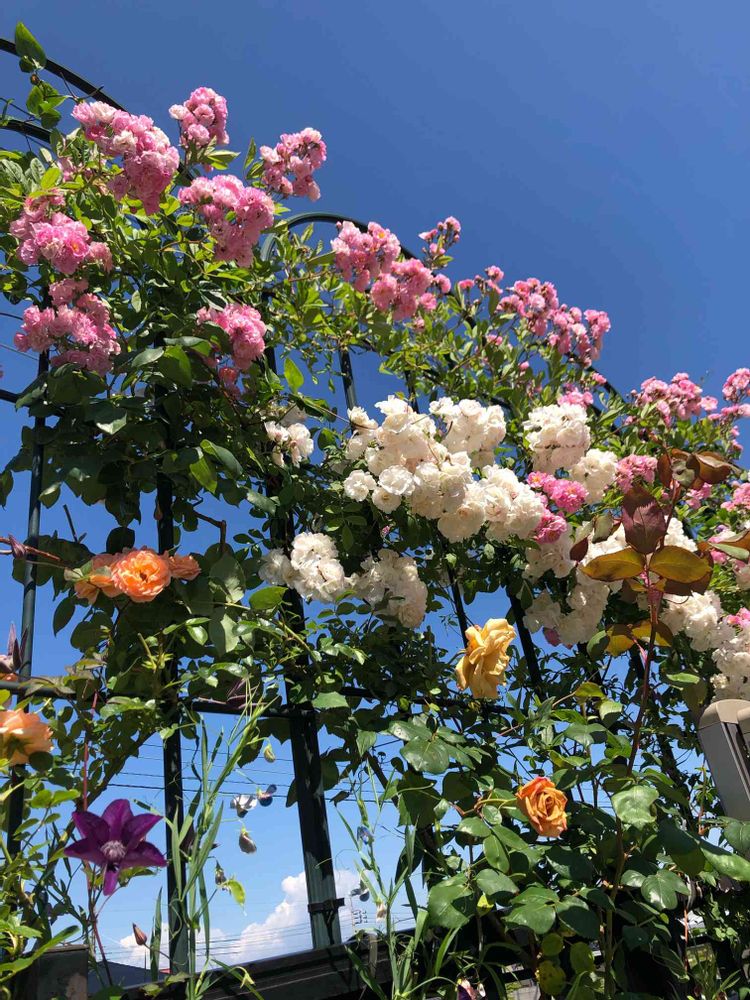 ピンクや白、淡いイエローやオレンジのメルヘンな印象の薔薇の下にクレマチスカシスの色合いがとても良いアクセントになっていて素敵ですね🥰✨✨